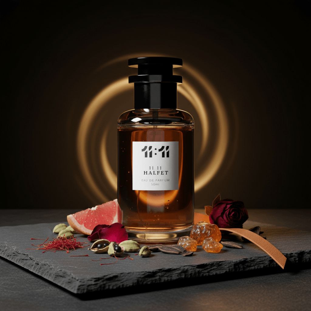 غامض، غني، وآسر. 11 11 هالفِت هو مزيج شرقي جريء يبدأ بنفحات حارة من الهيل والزعفران والحمضيات، ليتدرج إلى قلبٍ يزهر بالورد وجوزة الطيب والعود. أما القاعدة فهي عميقة ودافئة تجمع بين الجلد والعنبر وخشب الصندل، لتترك أثراً مغرياً ولا يُنسى. عطر فاخر ينطق بالقوة والأناقة والغموض.