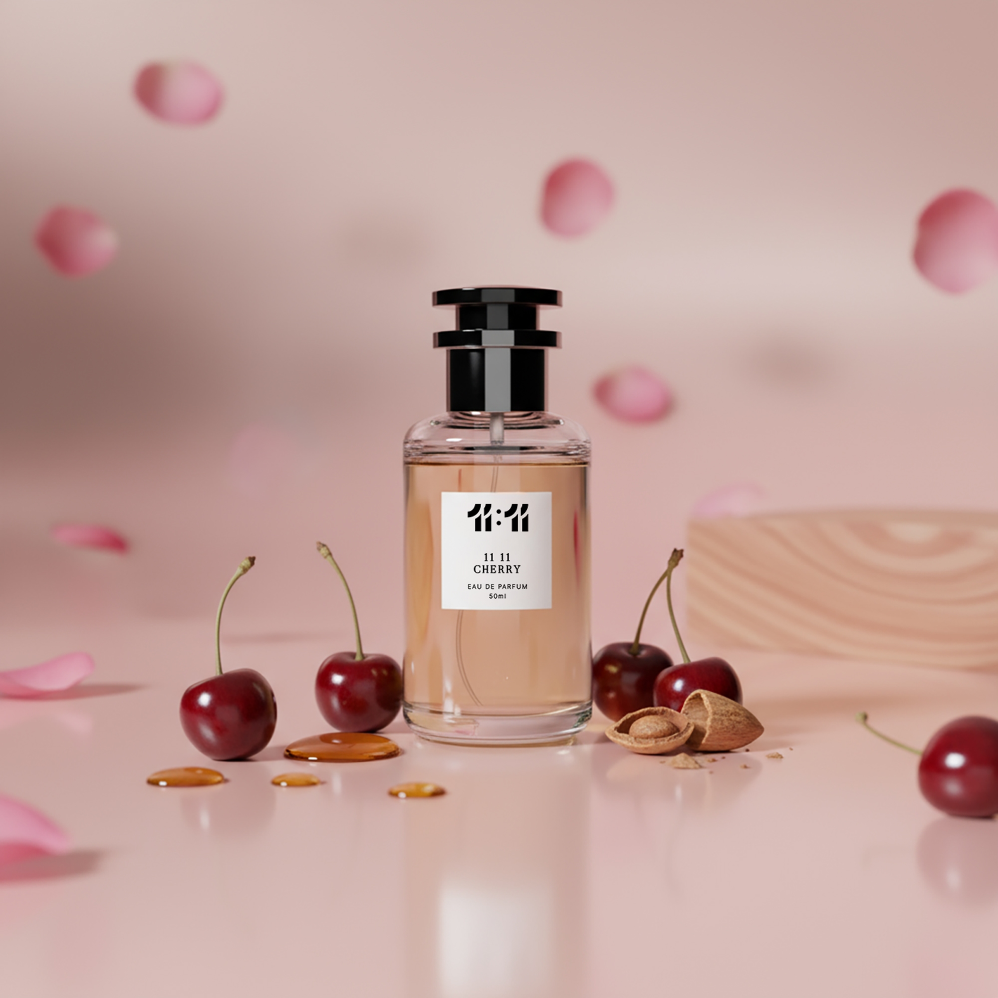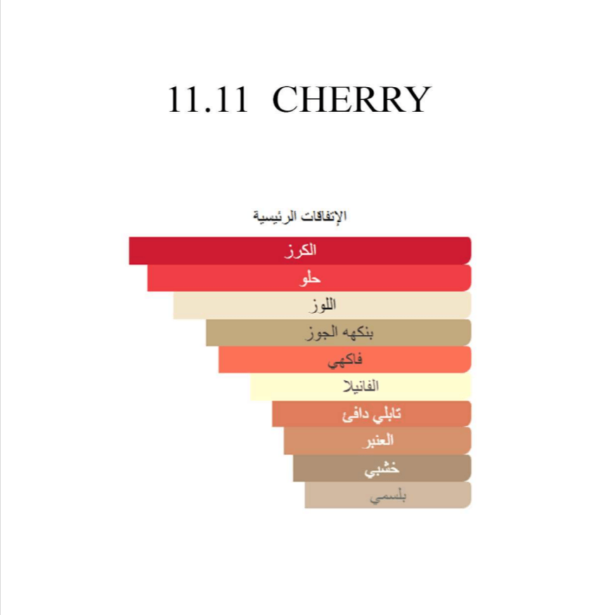 11 11 تشيري هو عطر جريء وغني يمزج بين نكهة الكرز الأسود العصيري، وليكيور الكرز الفاخر، ولمسة من اللوز المر. تبدأ هذه الرائحة النابضة بحمضيات حلوة ومنعشة، ثم تتفتح إلى قلب من الورد الرقيق والياسمين السامباك. قاعدة دافئة من خشب الصندل، والفيتيفر، وخشب الأرز تضيف عمقًا، لتخلق عطراً يجمع بين اللعب والأناقة في آنٍ واحد.