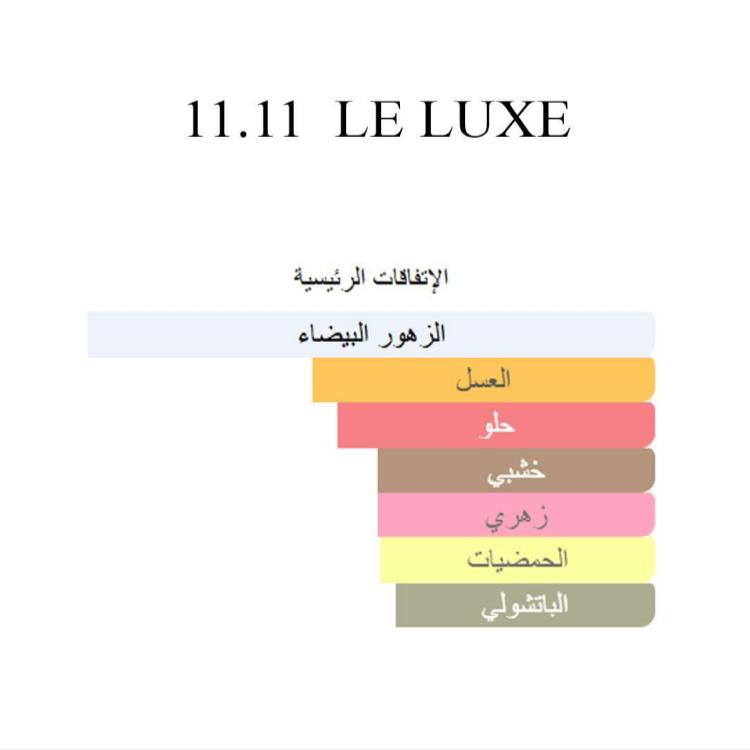 11 11 لو لوكس هو عطر مشرق وفاخر يجمع بين زهر البرتقال الرقيق، والعسل الغني، وخشب الأرز الدافئ.تجسد هذه الرائحة الساحرة الرقي والأناقة الخالدة، مثالية للحظات التي لا تُنسى.