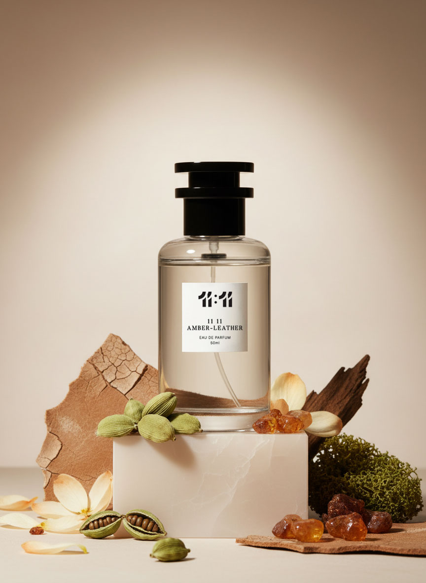 A bold, refined leather‑amber fragrance that exudes confidence and sophistication. 11 11 Amber Leather opens with a subtle spicy hint — cardamom — that gives a refined introduction. The heart reveals rich, luxurious leather softened by delicate floral touches, creating a sensual and modern character. The base settles into a warm, deep ensemble of amber, moss, and woods, leaving a lingering trail that is sensual, elegant, and timeless. Perfect for those who love a powerful leather scent with depth and personality.