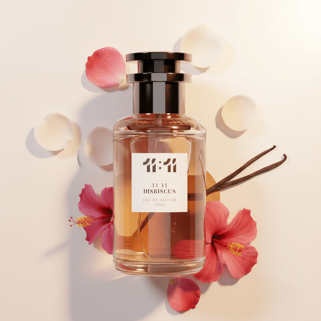 Exotic, radiant, and full of charm. 11 11 Hibiscus opens with a vibrant burst of fruity hibiscus and sweet rose, creating a lush and tropical floral heart. Wrapped in soft vanilla and warm leather, the scent becomes rich and sensual as it settles, leaving an unforgettable trace of elegance, femininity, and sunlit warmth.