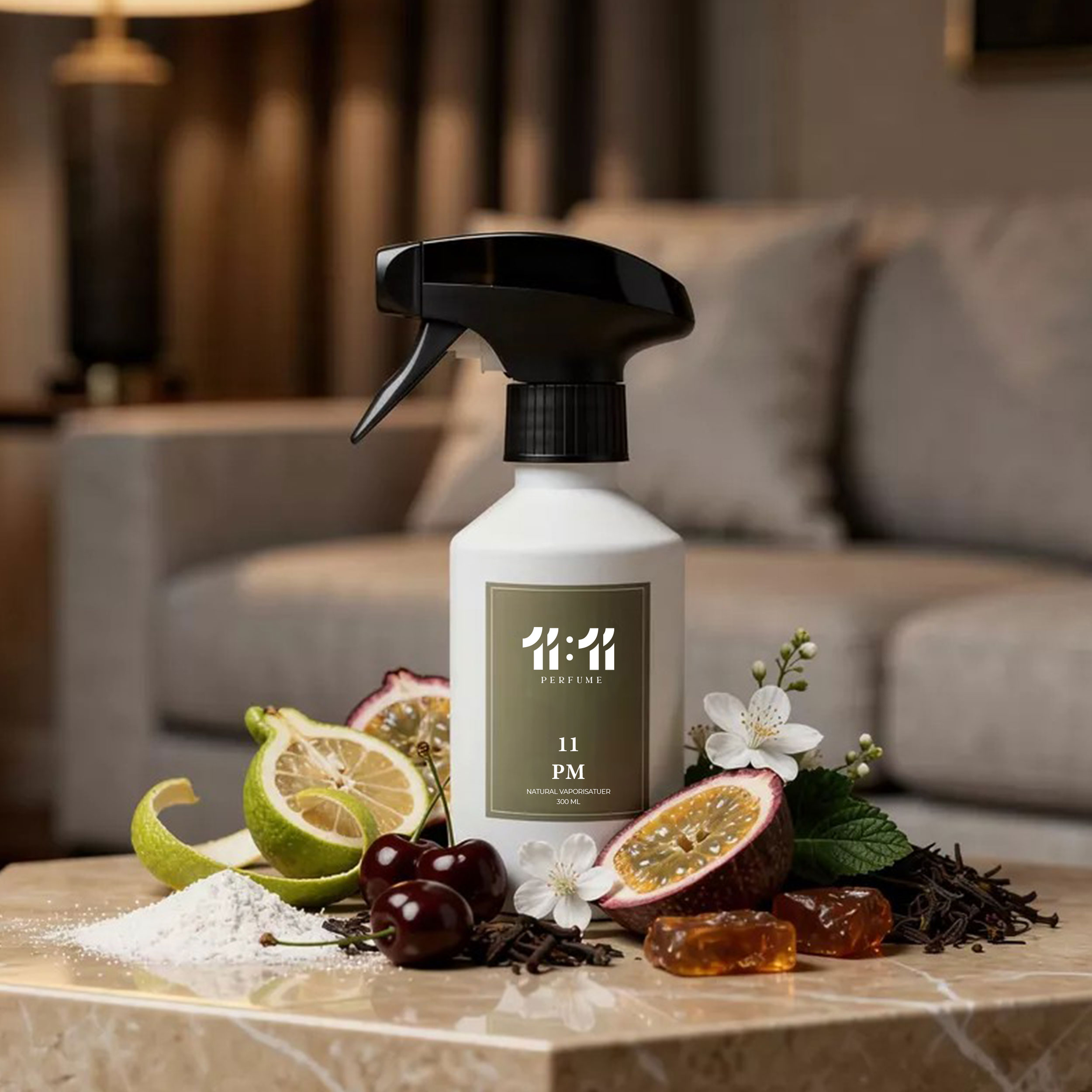 A rich and seductive fragrance crafted for evenings and intimate spaces. 11:11 PM Roshosh opens with bergamot, passion fruit, and cherry, delivering a sweet yet sophisticated introduction. The heart reveals jasmine, geranium, and caramel, adding floral warmth and gourmand depth. The base of patchouli, amber, and white musk leaves a smooth, sensual trail that feels cozy, elegant, and inviting.