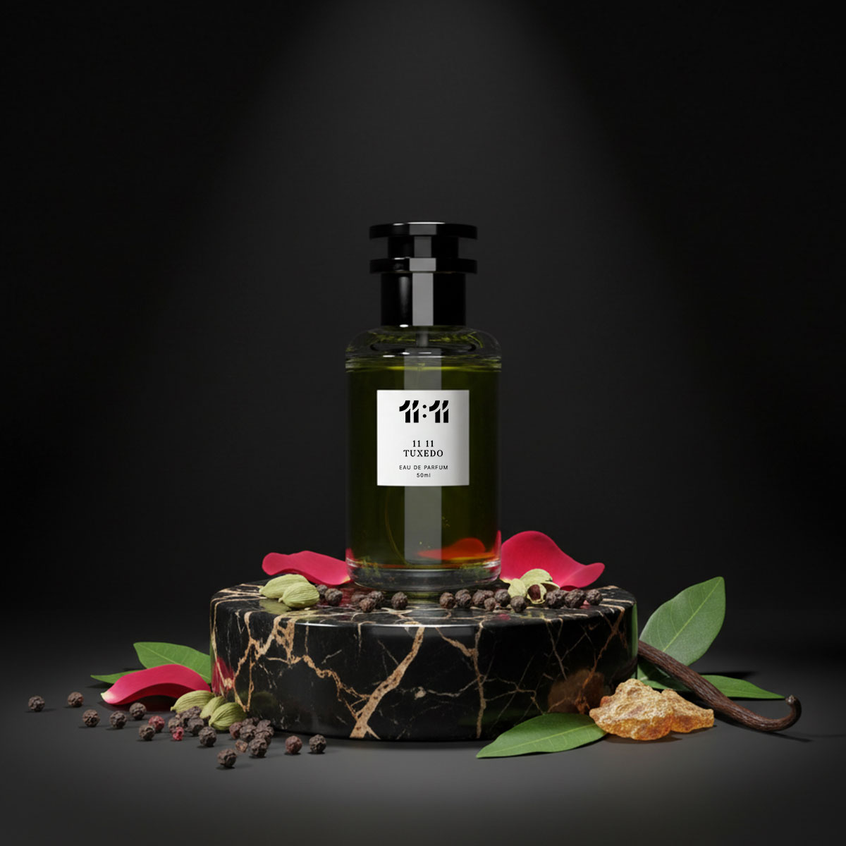 A daring, refined fragrance that captures the essence of contrast—just like the timeless elegance of a tuxedo. It opens with a spicy blend of black pepper and cardamom, melting into a sensual heart of rose and patchouli. The base is a warm veil of smoky ambergris and creamy vanilla, delivering a bold yet sophisticated trail that lingers with confident allure.
