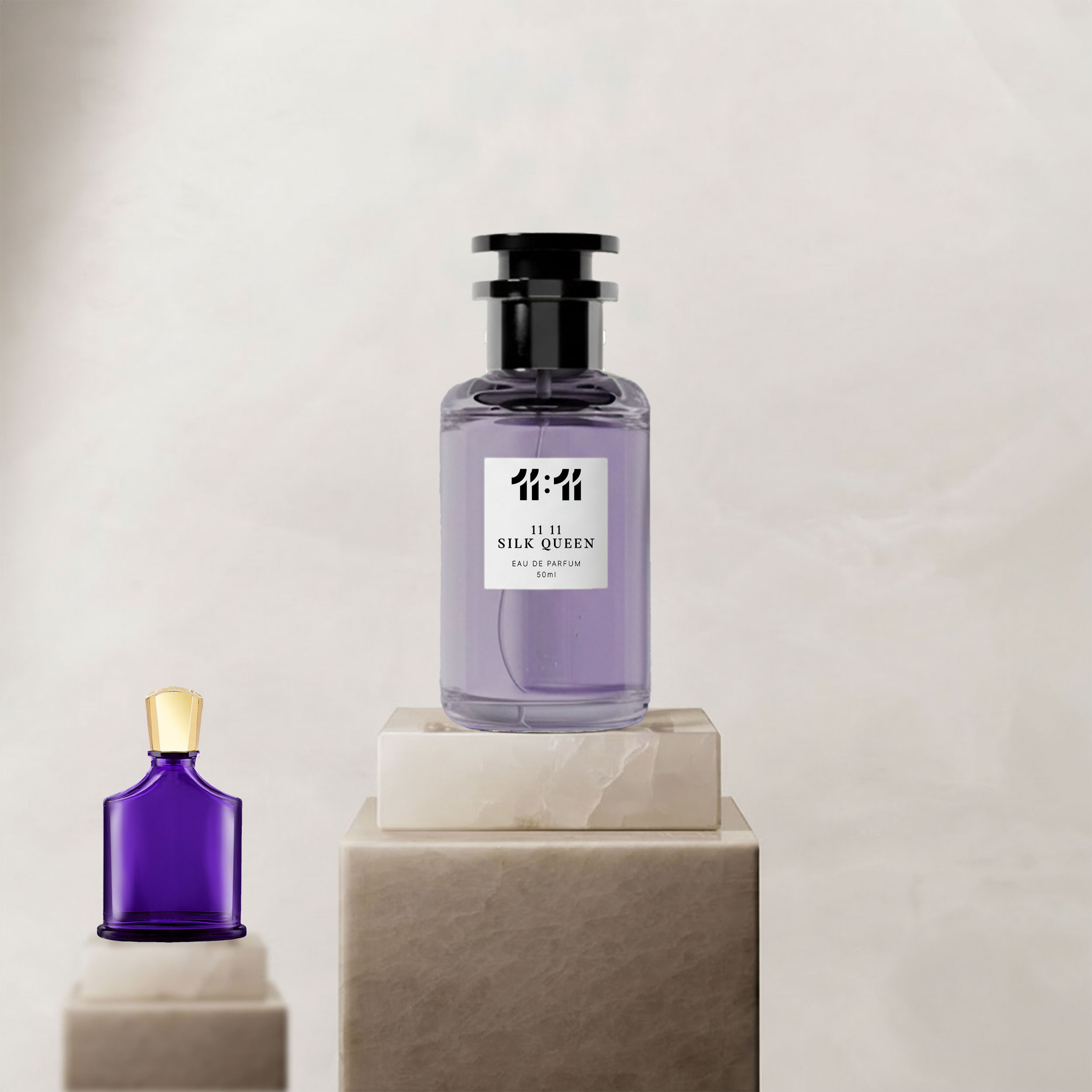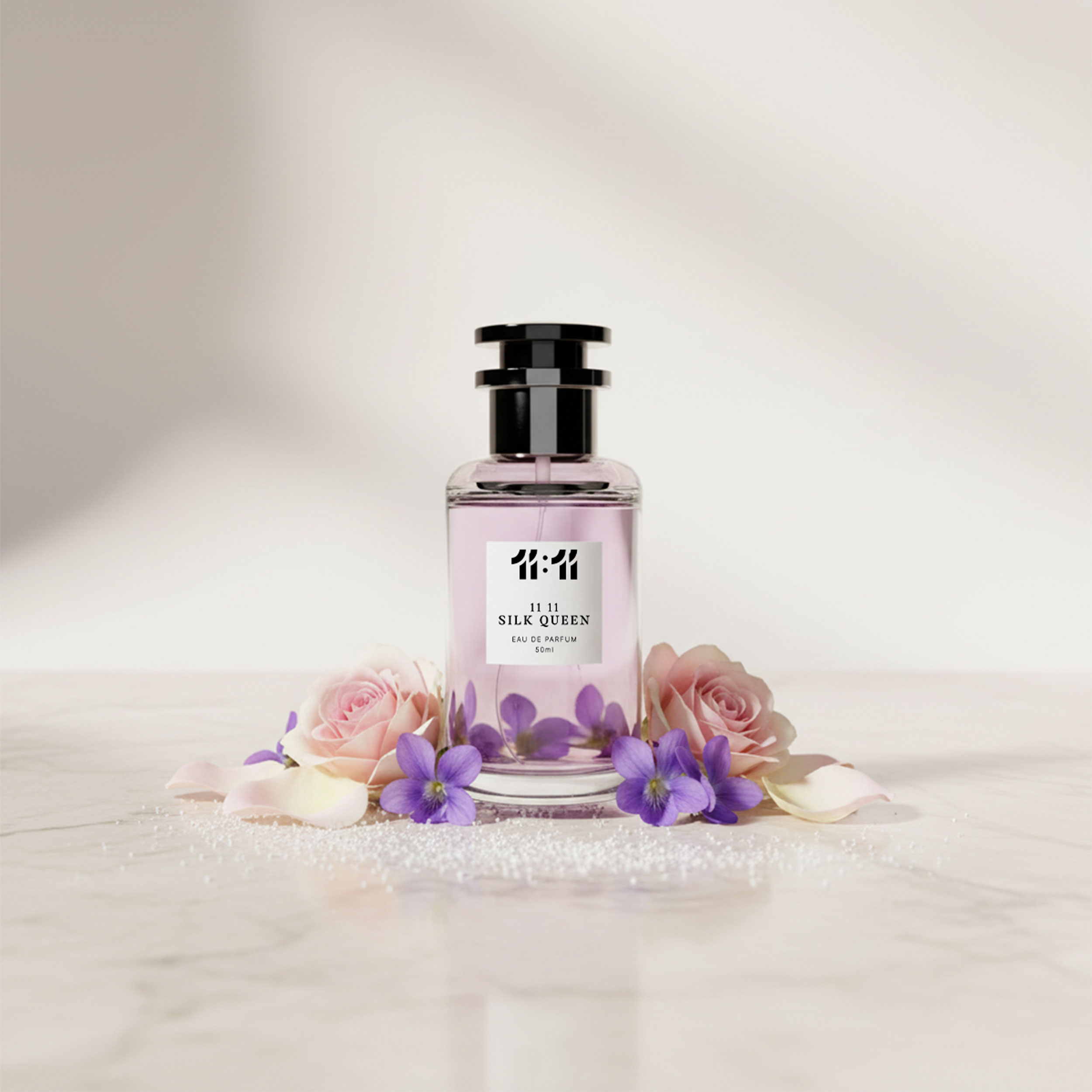 11 11 Silk Queen is an elegant and romantic fragrance that blends delicate rose, fresh violet, and warm musk. This enchanting scent embodies grace and sophistication, perfect for timeless elegance.