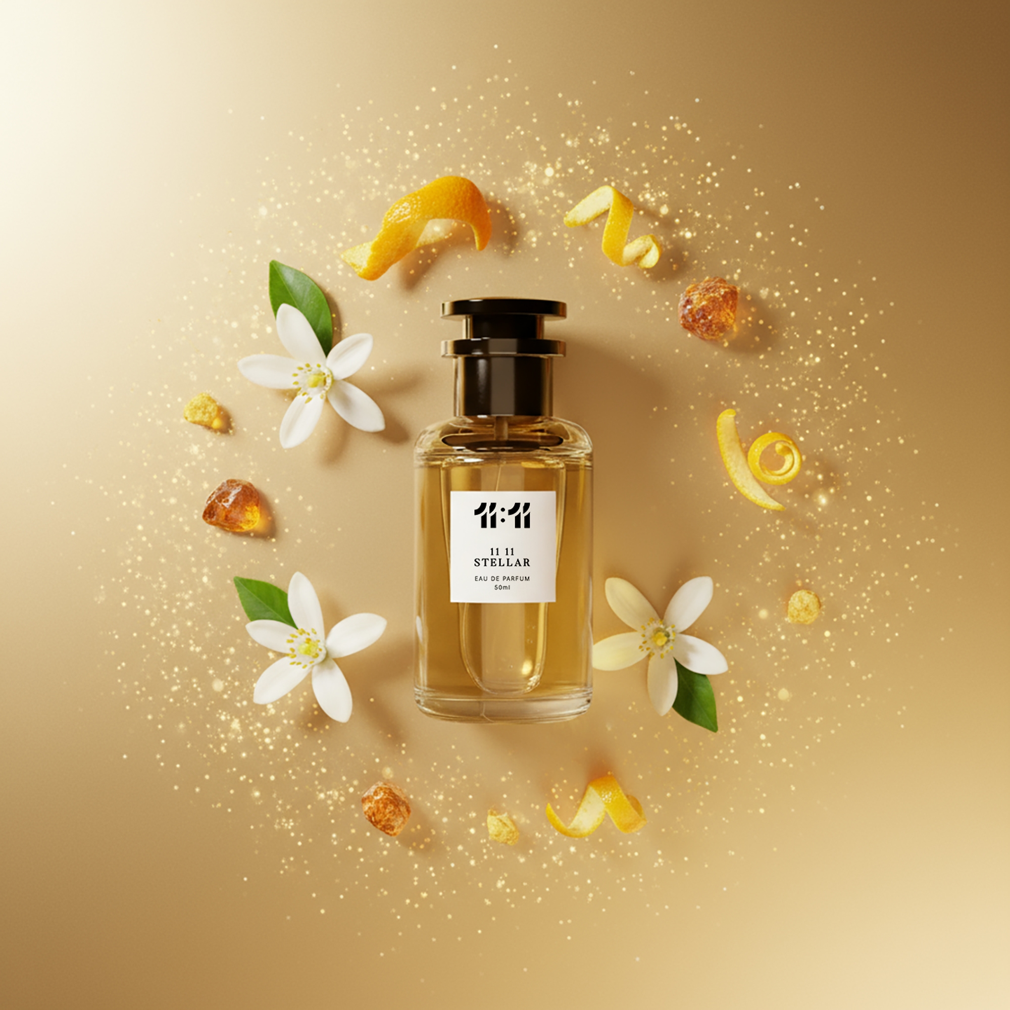 11 11 Stellar is a radiant and celestial fragrance that blends sparkling citrus, creamy orange blossom, and warm amber. This luxurious scent embodies elegance and timeless sophistication, perfect for those who embrace the beauty of the stars.
