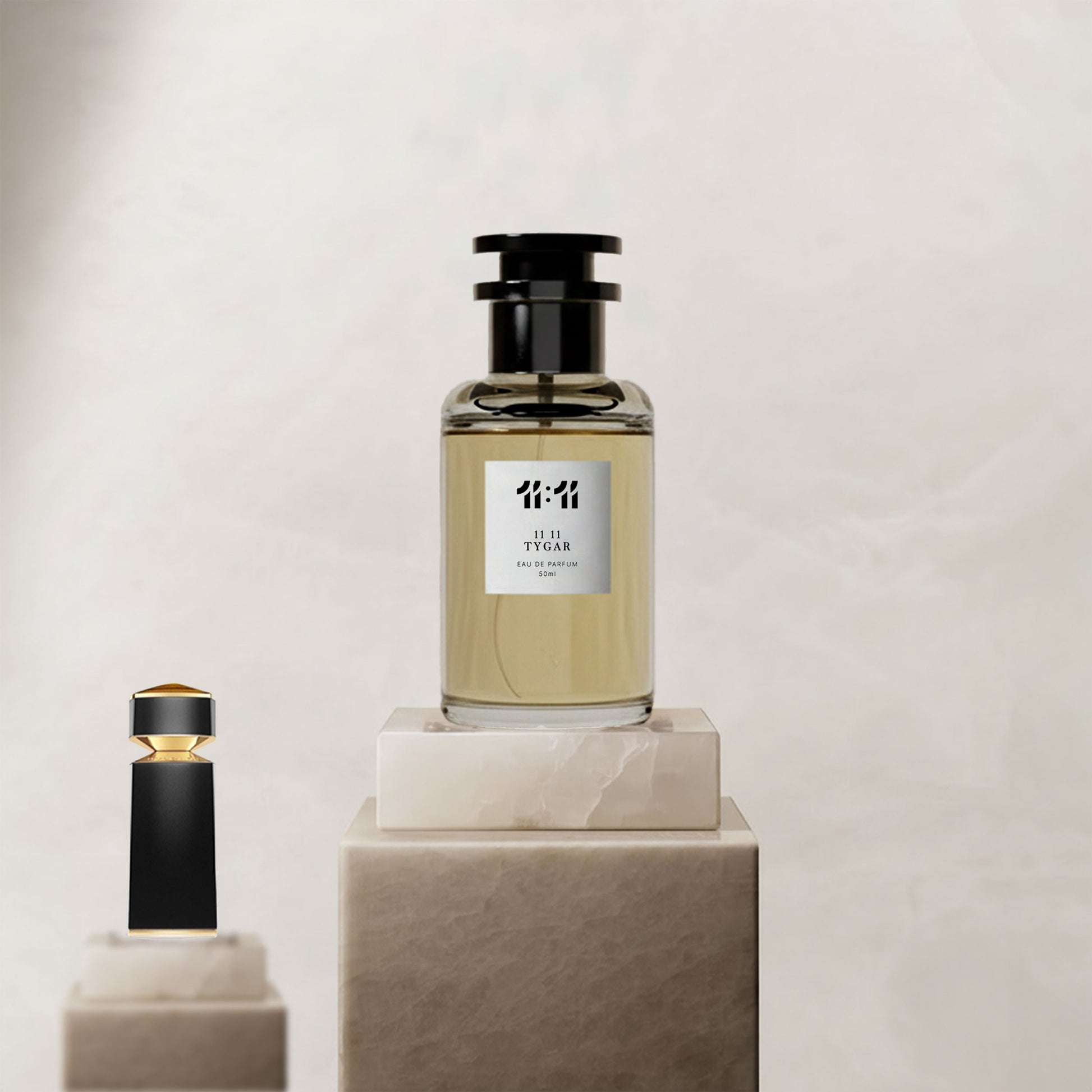 11 11 Tygar is a vibrant and magnetic fragrance that blends sparkling citrus, warm amber, and earthy woody notes. This bold and radiant scent embodies energy and charisma, perfect for those who dare to stand out.